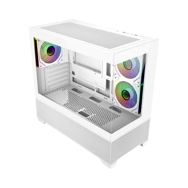 Su diseño en color blanco con panel lateral de vidrio templado permite exhibir los componentes internos, complementado con iluminación ARGB en sus ventiladores incluidos. Está pensado para configuraciones Micro-ATX, ofreciendo un equilibrio entre tamaño compacto y espacio interno suficiente para tarjetas gráficas de gran tamaño.